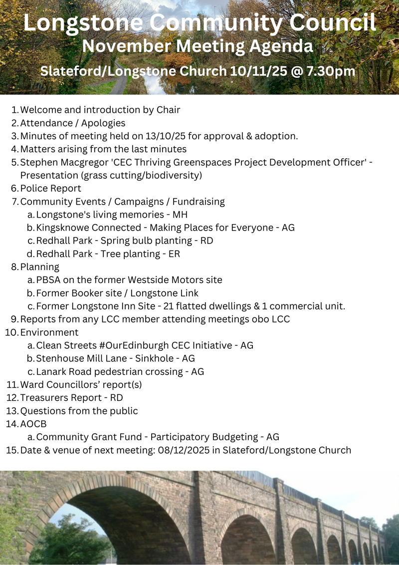 We represent about 4000 residents who live in most of the parish of Slateford/Longstone, which includes, not just Longstone, but Redhall, Slateford, Kingsknowe and the area around Dovecot Park south of Lanark Road to the river.